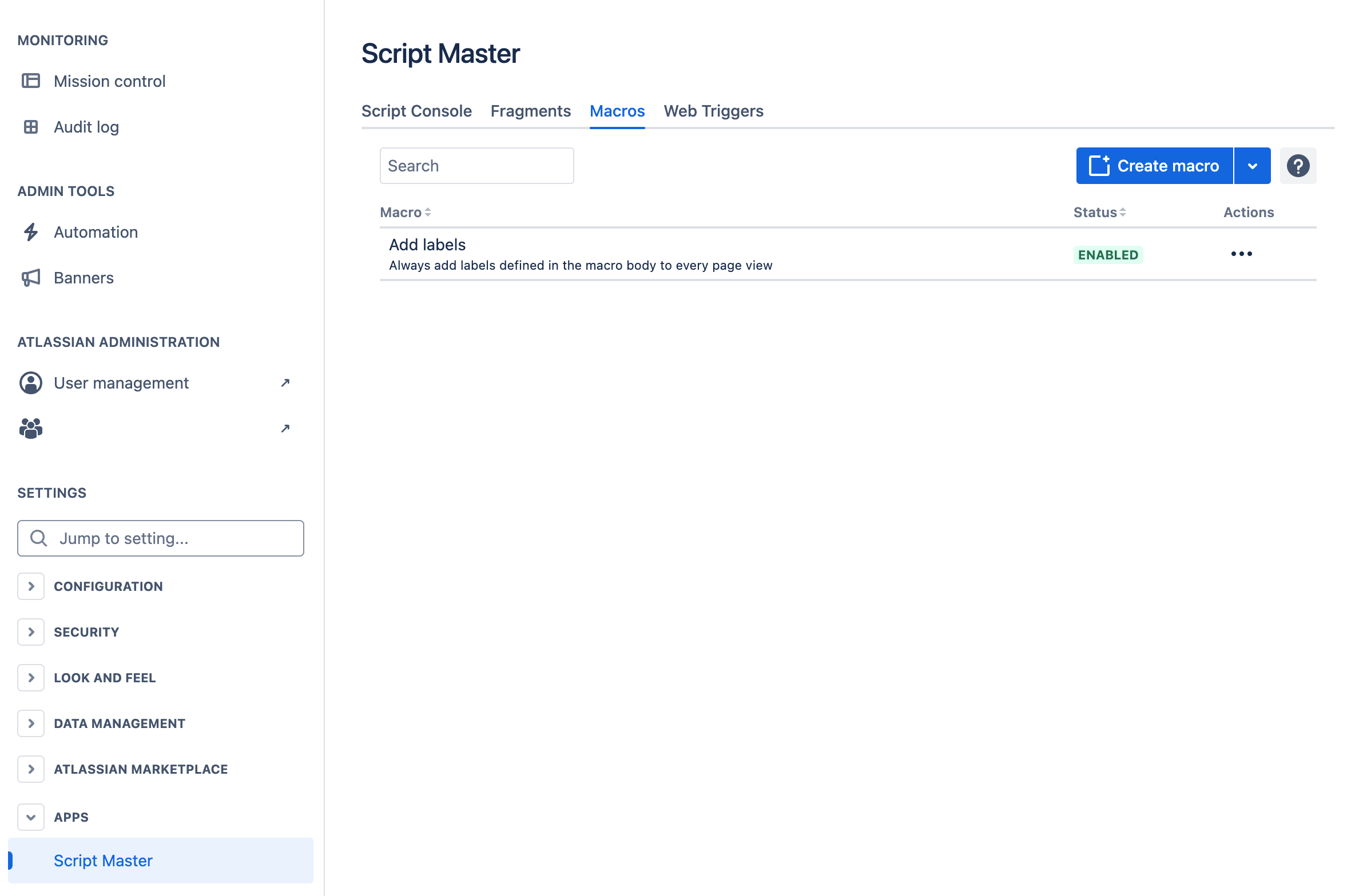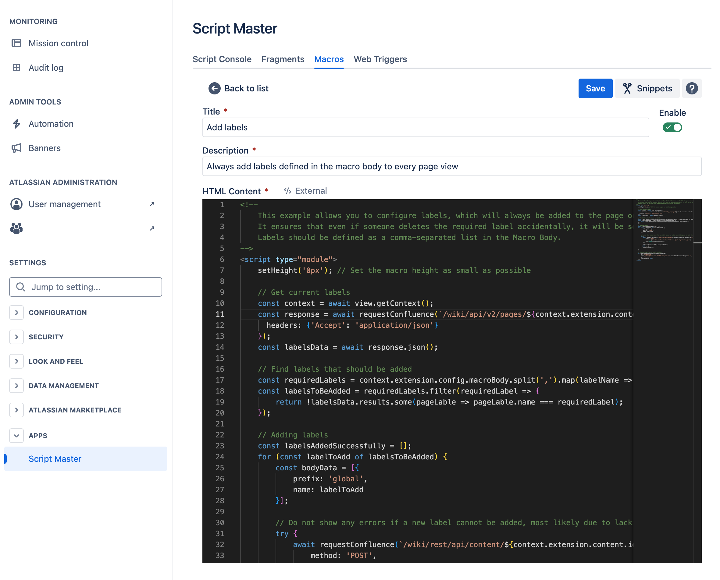 - Add labels. Read comma-separated labels from the Macro Body and add any missing labels to the current page every time the page is opened.