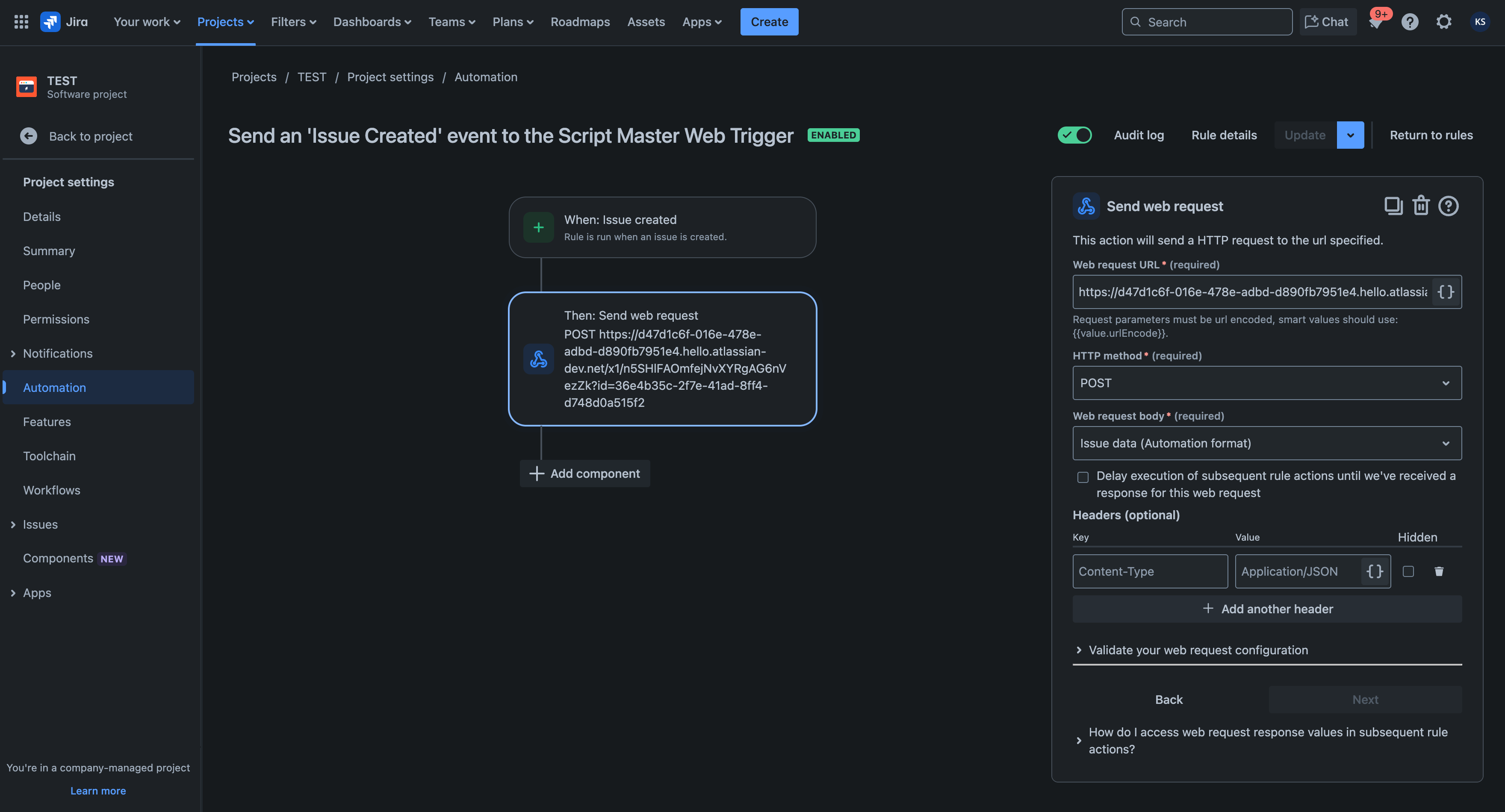 With both the Web Trigger and Jira Automation rule created, enabled, and saved, you can test the integration by creating a new issue in the project.
